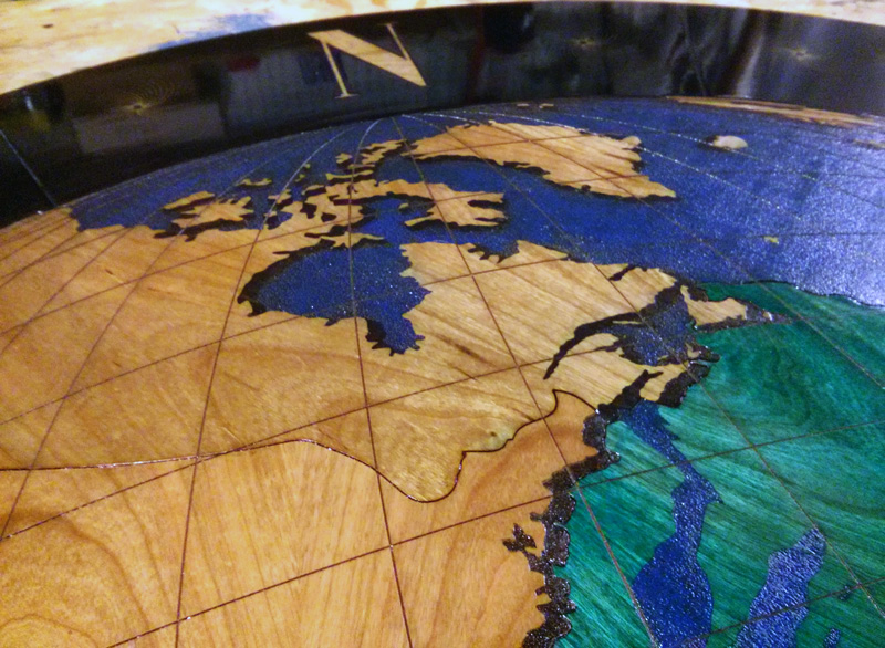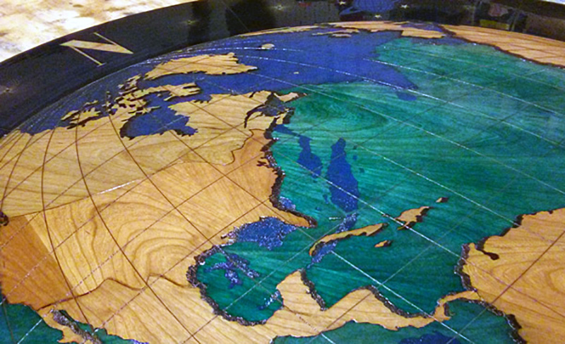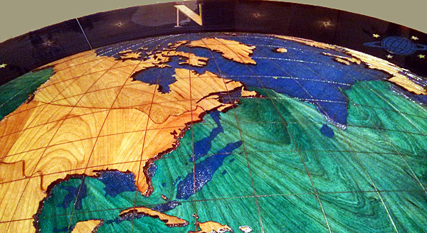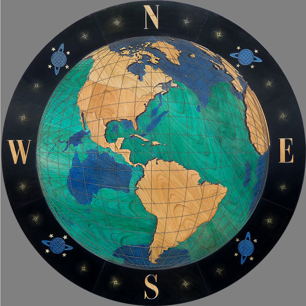 Fantasy Globe. Design depicts a globe as if it were see-through. On the front portion of the globe, continents are made out of wood. Continents on the other side of the globe are presented in dark blue, as if one were looking through the water/globe. Can be used as a floor medallion or table top. Fantastic in a beach house or a yacht.